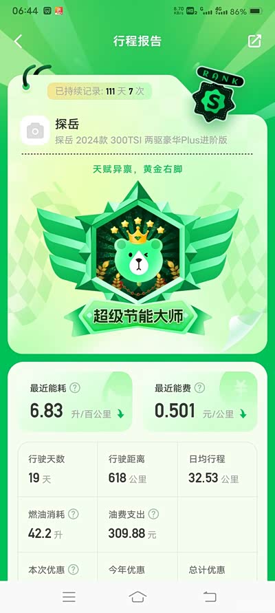 图一是基本全程高速的一次记录,兰州往四川某地全程770公里,满座重载,出发满油,60升油箱终点剩了3/8,高速有小一半路限速80的,一半高速路限速120,算上休息,高速堵了小一个小时和非高速路,平均速度70公里每小时。油耗5.1个,要是继续往重庆跑,全程1000公里正常跑,一箱油脚轻点是可以拿下的。