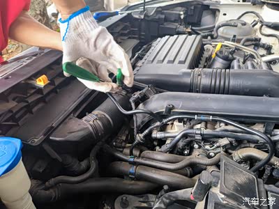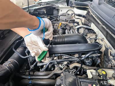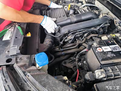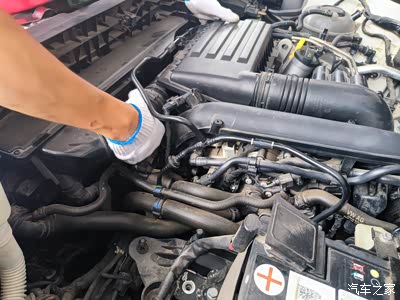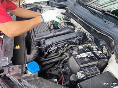 终于轮到我了,师傅终于忙完了,一看师傅就挺专业的,上来先看一看,然后就开始动手操作,让这个节气门露出来,方便检查。首先是拆卸空气过滤器和这个通气管。