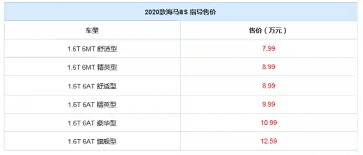 2020年6月11日,2020款海马8S(参数|询价)正式上市。新车共推出6款车型,售价区间为7.99-12.59万元。新车主要针对配置方面进行调整,并对静音效果升级。动力方面新款海马8S继续搭载1.6T发动机。此外,自动旗舰型的首批车主还将享受到红色刹车卡钳、内饰氛围灯、智能钥匙、主驾电动尾门开关等装备;自动豪华型和自动精英型的首批车主获赠智能钥匙。