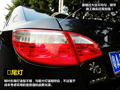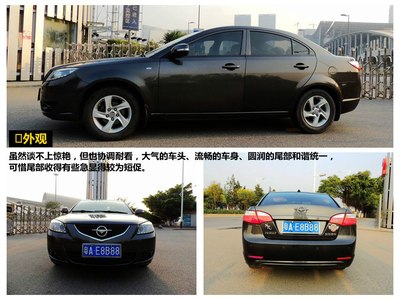 【外观】外观大气、时尚、饱满、稳重!线条也十分流畅!动感的前脸,时尚的大灯,招风的大耳目,上翘的车身,给人耳目一新的感觉,可惜尾部设计太过平庸、紧凑,整体不太协调 。
