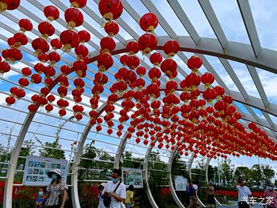 一个独特的大棚上面挂满了,红色的小灯笼这就是国庆佳节带来的气氛,红红火火过国庆!