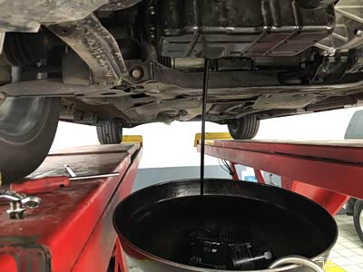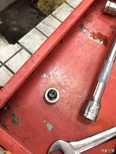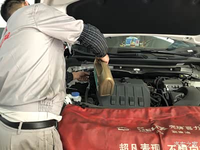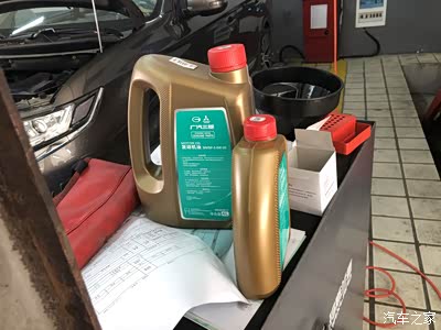 在放机油的过程中,师傅也四轮测测了胎压,由于天有些冷了,都加到2.6pa。同时,放油螺栓也换掉了,是广汽三菱的召回活动。机油放完后,新机油也拿过来了,SN/GF.50W-20,一大一小,总计5L。三菱奕歌这车机油要加4L多一些,所以每次保养,就会浪费掉一些,可惜,这剩下的能不能带走呢,我心里想着,哈哈!新的机油加起来了。