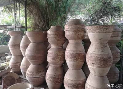 一排排的土陶罐,就是家里最常用的那种,用陶罐堆积起来的造型,也十分特别。