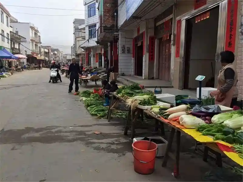 街道上摆卖猪肉蔬菜,很安静,很和谐的感觉[愉快]