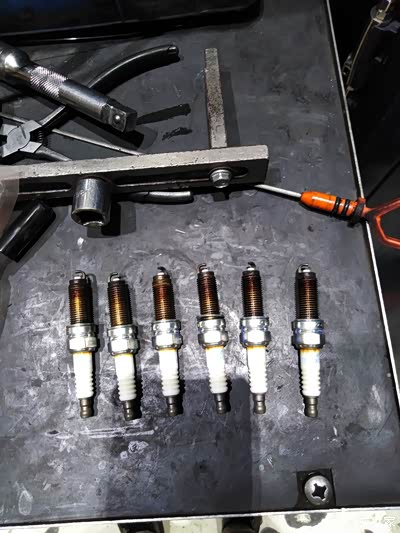 三、从拆下来火花塞看燃烧得不错,6个火花塞成色差不多,看来并没有因为这发动机有闭缸功能(本车大部分里程都是跑高速,定速巡航时间较多)而导致其中两缸火花塞的燃烧不好容易引起积碳(网上一些车友言之凿凿认为闭缸功能不好造成积碳,甚至有人通过改装关闭闭缸功能)。拆下来的火花塞是NGK的,换上去的是电装(日本原产)的。可以肯定的是,本田车用铱铂金火花塞的更换周期为十万公里完全没问题(说明书也是如此规定,别听修理店的随便缩短周期),我的另外两台车CRV和思铂睿,都是十万公里更换。