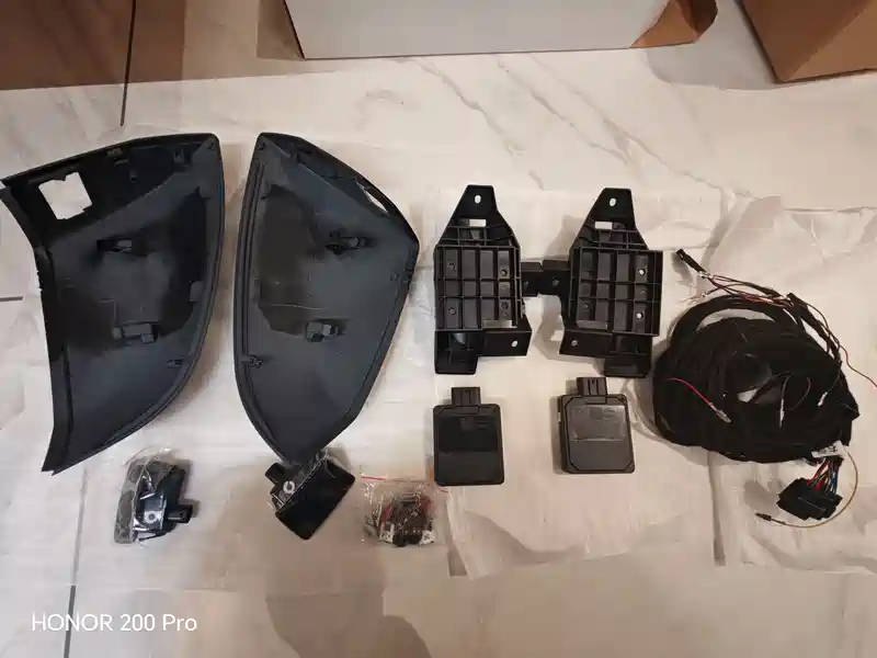这是全家福,包含原厂变道后视镜壳、原厂变道灯、副厂原位支架、副厂变道雷达、变道灯线束和雷达线束、安装用的螺丝和两个保险。