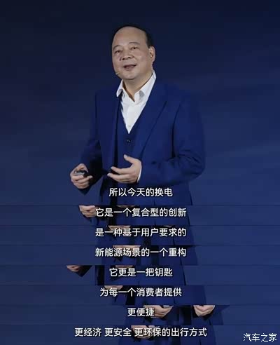 所以今天的换电,它是一个复合型的创新,是一种基于用户要求的,新能源场景的一个重构。它更是一把钥匙,为每一个消费者提供更便捷、更经济、更环保的出行方式。