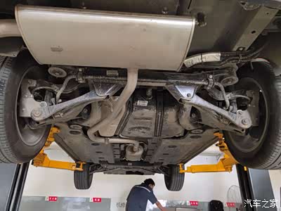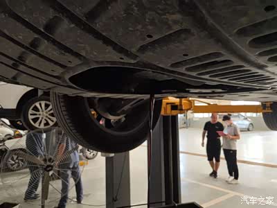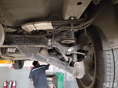 整个底盘还是很平整的,下面有发动机护板,我说再安装一个结实一些的吧!技师说没必要,这个已经达到防护的标准了!车辆后轮的悬挂还是比较复杂的,这就是FSD减震系统!