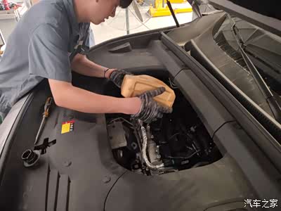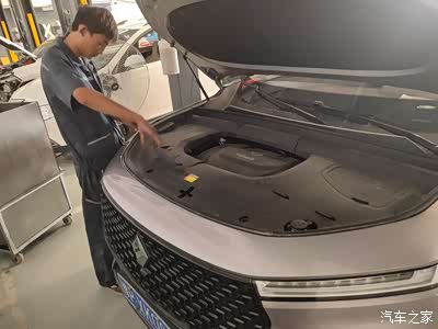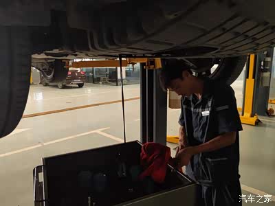 当天气温高达39摄氏度,天气很炎热,在售后车间温度能达到40度以上,旁边的风扇全是热风,在这样的条件下工作,一线的维修技师还是比较辛苦的,也请广大车友在夏季高温天气进站保养的时候给与一线技师一个肯定,真的很辛苦,技师现在正在拆卸发动机防护罩,在与技师沟通中了解,RS-5这款车厂家发动机防护做的比较到位,相对于别的车型来说这款新车保养起来比较复杂!有些地方不好下手!