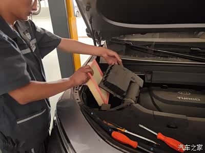 空滤已拆卸完毕,技师说这个吹一下,不脏可以不用更换,因为这个是自费的所以为了节省成本暂时先不更换,首保只是机油机滤以及工时费免费,其余项目全是自费!