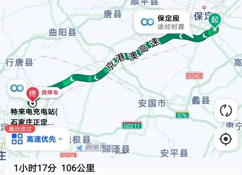 30公里外的石家庄鹿泉服务区补电,因为过了鹿泉后就要从华北平原翻跃太行山到黄士高原,一路上坡,一定要把电补到450以上才可以,这140公里路段可是无充电桩,无大城镇,但电网 APP 中已经能看到鹿泉服务区桩已全占满,果断改变计划,提前下高速。在石家庄正定机场特来电充电站同样充到了450公里。这时已经是下午3点半了。
