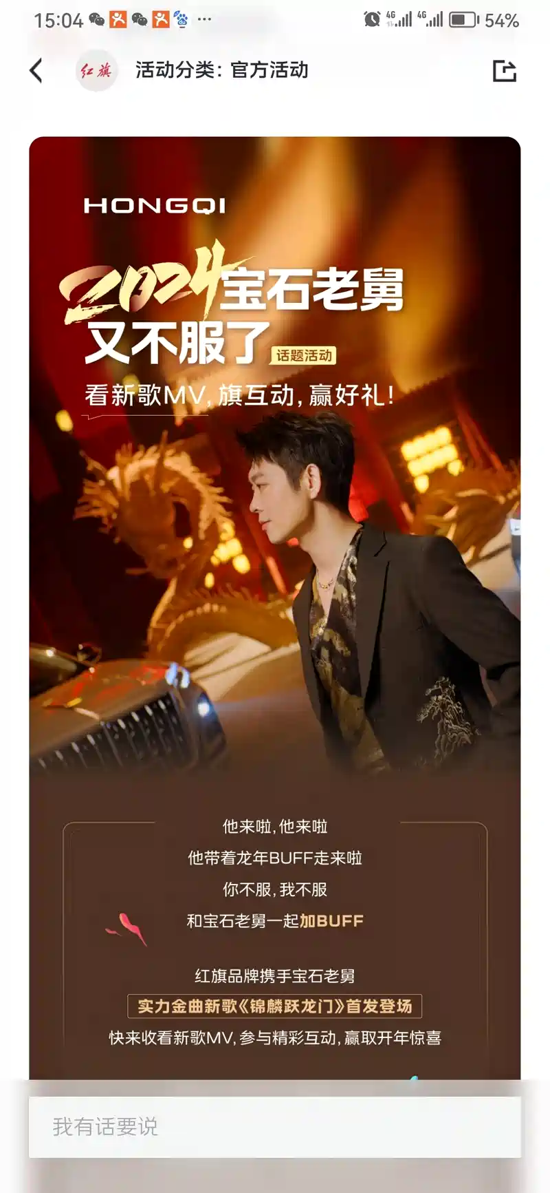 龙年将至,作为红旗车主必须与红旗一起叠满 BUFF ,勇往直前。红旗品牌携手宝石老舅,实力金曲新歌《锦麟跃龙门》首发登场新歌 MV ,充分体现了红旗品牌是大国重器,传承民族国风音乐 BUFF ,让全国红旗车主一起体味国风音乐的独特魅力。