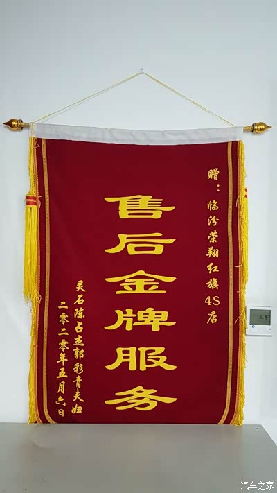 售后工作人员接待我进接待室,迎面而来一面锦旗,不开空调15℃温度,看来红旗的服务是越来越好啦!