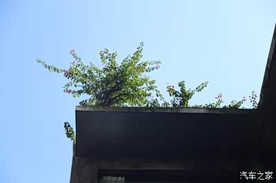 阳光明媚,楼顶的植物长得很茂密,红花朵朵。