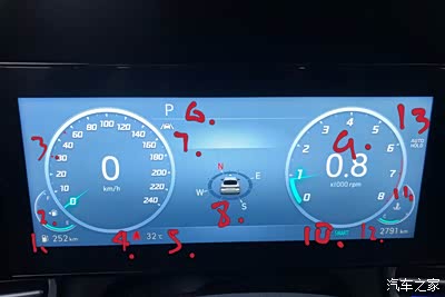 然后我们再看看仪表盘上到有什么东西,以正常情况为例,下面图片我用数字一一注明,1.表示油箱里的油大概还可以跑252公里的意思,2.油箱容积,旁边有个向左的标志,表示油箱在车子左边,3.时速表,表示车速。4、未系安全带。5、今天室外温度。6、档位。7、车道辅助功能 8、指南针 9、转速盘 10、驾驶模式 11、水温12、总公里数,13、自动驻车开启