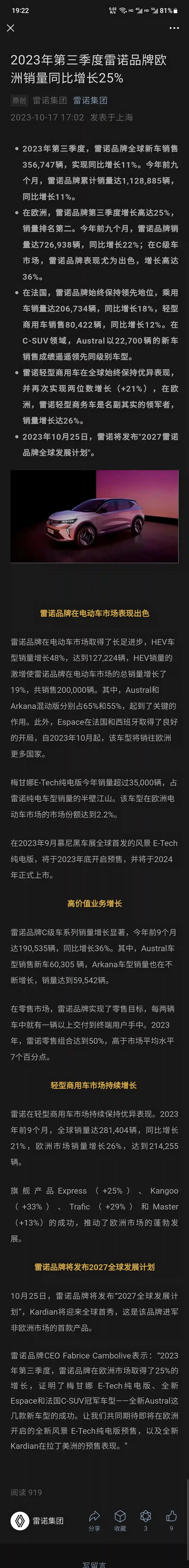 2023年第三季度雷诺品牌欧洲销量同比增长25% 删除 推荐精华 置顶 取消置顶 关闭回复 打开回复 推荐编辑 楼主禁言 移动帖子 重置头像 操作记录 JN叁零壹 0浏览 · 2023-10-17 19:26· 发布于山东 2023年第三季度雷诺品牌欧洲销量同比增长25% 举报 打开汽车之家 阅读体验更好 精彩热门 更多 朗逸星空版提车作业 小鹏G9提车作业分享 红旗H5提车作业分享 骓1200使用体验分享 摩托车运动相机怎么选 第一台弯梁的诞生 查看更多 打开汽车之家 互动体验更好 微信好友 微信朋友圈 新浪微博 QQ好友 QQ空间 取消 相关推荐 加载中