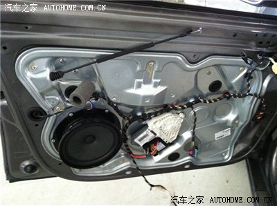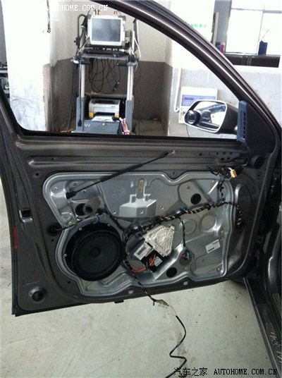 门板内部还是比较整洁,不过没有拆车坊里见过的日系车身上披的隔音材料,做工严谨,包线还算规整,透过车窗就是开通隐藏功能的PC啦,大家都懂的。