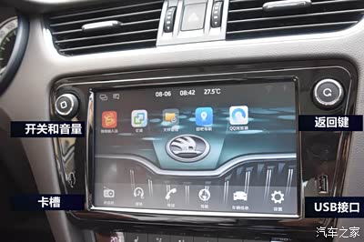 这套系统按键布局比较简洁,左上角是驾驶员最长使用的开关和音量按键,右上是返回键和菜单选择键,中间是一块9英寸的触摸屏, 左右两侧是SD 卡槽和USB 接口,USB 接口下面还有一个收音的孔。