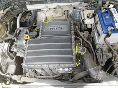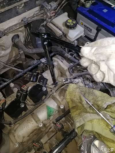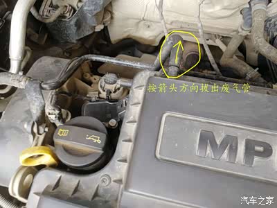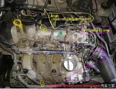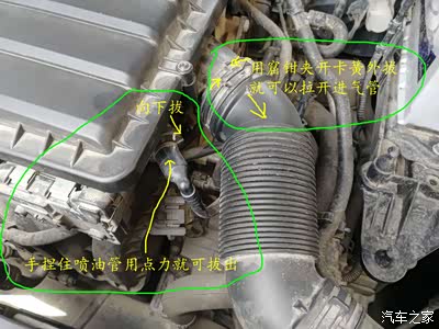 1,拆除进气罩-----》就是发动机上面那个塑胶壳子,先把3个管子拔掉------>废气管、进气管、喷油管,再用力往上提就可以拆掉。
