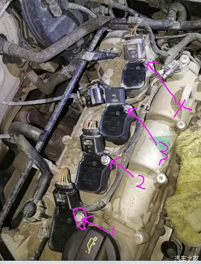 3,插头拔开后,就可以用棘轮扳手拆点火线圈的帽子固定螺丝(建议拆1个装1个)