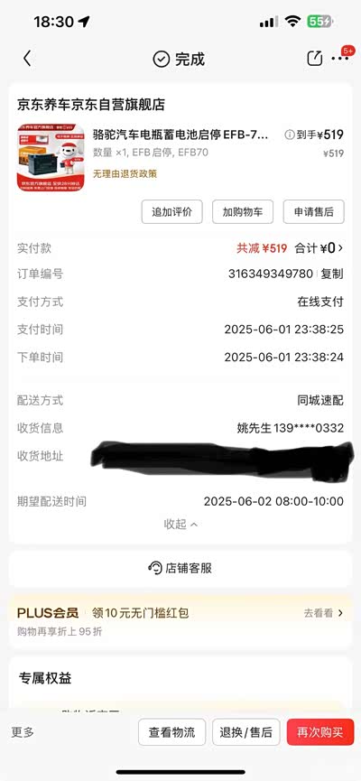 我在某东养车618促销时购买的骆驼电瓶,费用519,包含上门更换。在网上购买时,下单付款后,会有安装师傅与客户沟通确定更换时间,还是非常方便的。