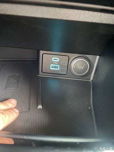 驾驶台掀开盖板,里面有USB充电口,满足苹果和其他手机,我手指的地方可以放置手机,无线充电,这个很人性化,就是充电稍慢,我苹果充了半天才%之几,之后就用的电线充了。