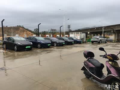 (2)第二站:汕尾陆河美食城站(这个站585的可以考虑补电了),这个离高速口贼近,好像就1km左右,好方便的。广州嘉禾过来这个站大概是280km(所以标续如果直接满电从广州过来应该也够电来的,应该。)。所以我是广州直奔到这个站补电。哦对了,这里同时还有特斯拉的超充站。这个充电站是完全免费,没有收费杆。