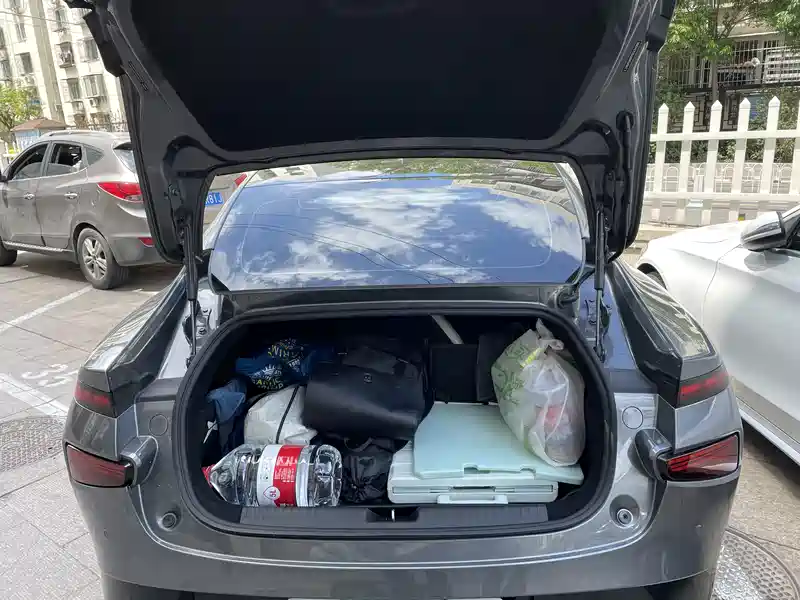 P7后备箱的开口是硬伤,搬放东西不方便,好在进深还可以能够塞进不少装备,我带了一个天幕、两把椅子、一个蛋卷桌、收纳箱、野炊锅、卡式炉,还有一些背包零食、饮料纯净水等杂七杂八的东西,装完之后空间还有一定富裕。