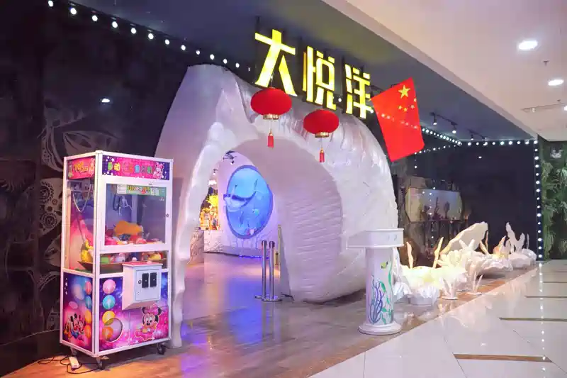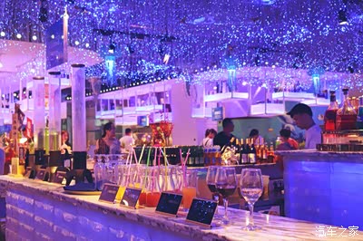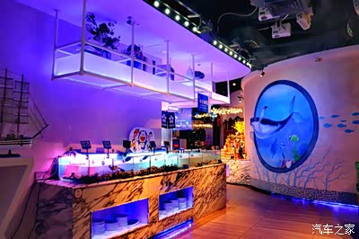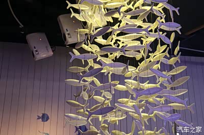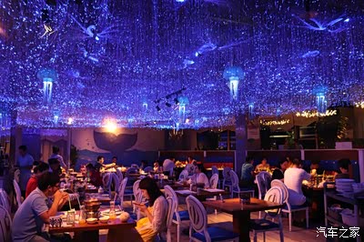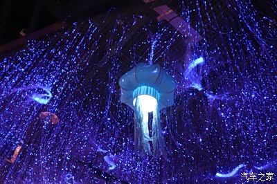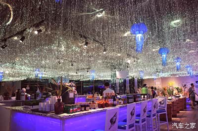 小鱼、水母漂浮在空中,闪烁的小灯既像海底生物、又像流转的星空,主体灯光是蓝色系,梦幻本幻、浪漫本漫了