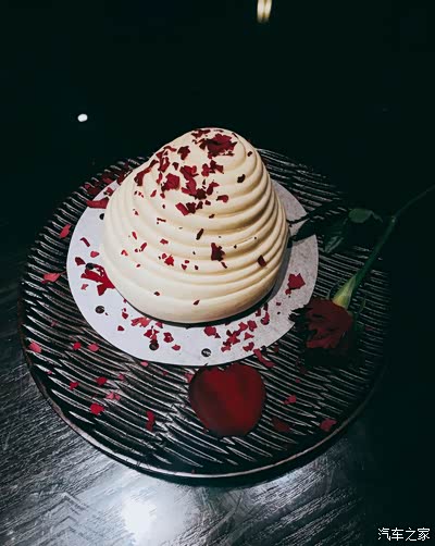 吃之前仪式感满满:双手拍一下用液氮冷却过的玫瑰花,花瓣洒下落在花卷上,好看;
