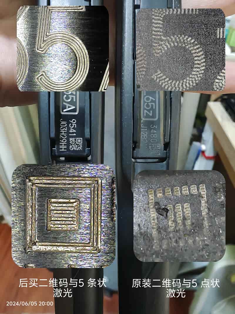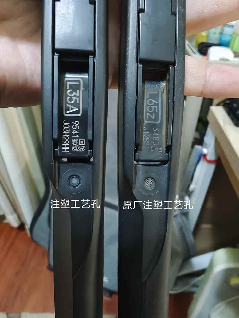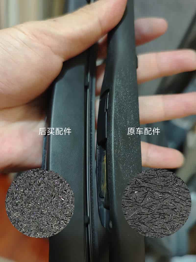 我一直好奇原车配的雨刮骨架为什么那么的耐用与坚硬。5年过去了依然没有变色,可能是换过很多次胶条拆装与使用,卡扣部分左右间隙有点大,刮起来有点摇。就拆下来研究一下,因为4S报的价太高了。在🐶东上找了家卖原厂件评价好的订了一套。虽然看上去质量还是很不错,包装也是原厂包装,扫码也有逆源信息。但用显微镜下还是有很大的区别。这也印证了为什原车的配件质量那么好的原因,原厂雨刮骨里加入了碳纤维,而普通与副厂就只是纯朔料。