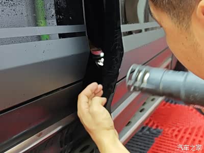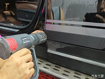 这就需要用烤枪了,将划开的位置简单烘烤,注意温度不要过高,时间不能过久,边烤边按,贴在车门内沿。