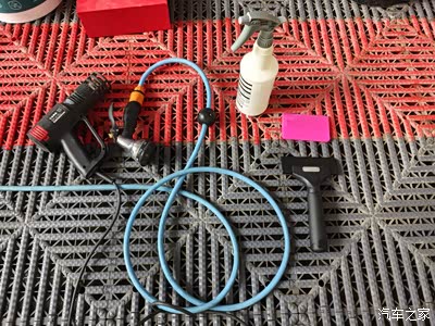 小哥先准备好各种工具,烤枪、刮板、喷壶。。。要是自己贴,可没有这么多家伙事儿。