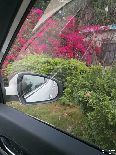 镜子清晰可见,大大提高行车安全,旁边的花开的好美,就是不知道是什么花