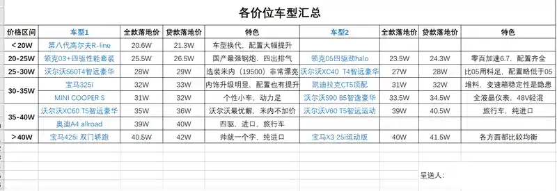 Volvo本来一直也是我俩的心头好,结果相中的V60 cc没有引进,XC60选装米内又太贵,至于GLA,Q3,XC40,又看起来不协调,不符合我俩的审美,而宝马X1那令人发指的后排加长完全与操控没有关系,至此好像陷入了一个无解题(其实就是穷却啥都想要),B级车不想要,普通品牌的SUV不想买,中配的豪华品牌的中型SUV超预算,豪华品牌的紧凑型SUV太难看。实在没办法,列了一份价格跨度比较大清单(夹带了私货)提交给LD,让她做决定,结果LD扫了一眼,把我的报告丢在了不起眼的角落……