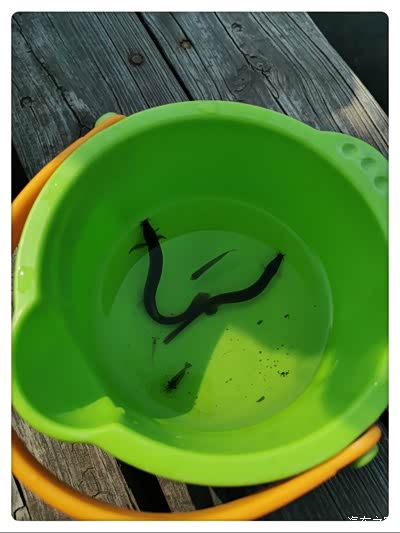 这是一小朋友的鱼获:数量不多,种类不少,泥鳅、小鱼和小虾俱全。可惜我们功课做的不够,什么都没带,公园里除了两三处卖水的,也没看到卖抄子、小桶的。带孩子去的最好自带工具。