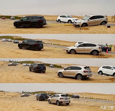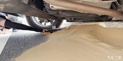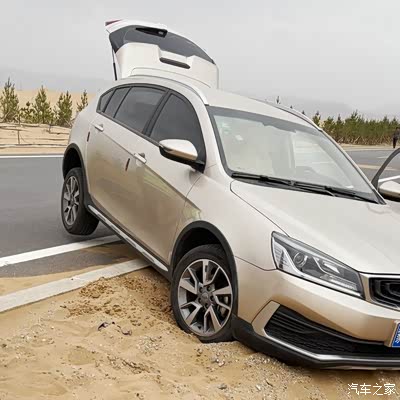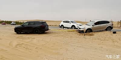 这辆车前轮陷进软沙,后轮翘起,油箱后段卡在马路牙子上。估计是刚陷车的时候给油自救来着,前驱车越给油,前轮越往沙子里陷,再加上中间卡着马路牙子,所以后轮像跷跷板一样悬空了。