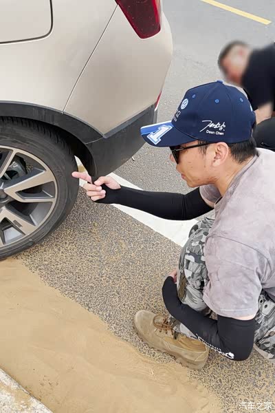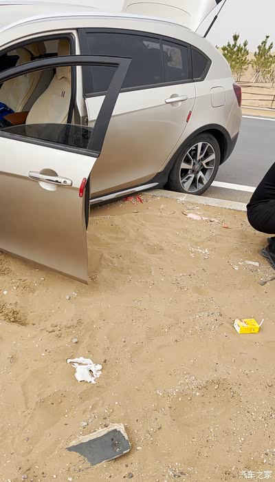 底盘2/5已经搓到沙漠里了,为了避免因救援造成的二次伤车,也考虑车后是公路有过往车辆,所以选择往沙漠里拉。千斤顶把后部顶起一公分足以,只要让底盘离开马路牙子就行