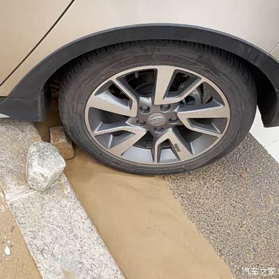 后轮与马路牙子之间垫一块石头,为避免拖拽时伤到后悬挂