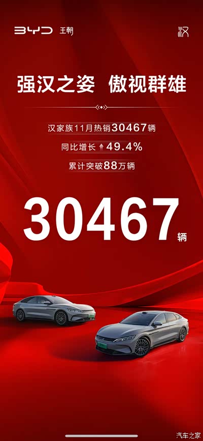 比亚迪汽车11月销量达到惊人的506840辆,其中旗舰轿车“汉”月销量30467辆,时隔两年月度销量再次突破3万辆。