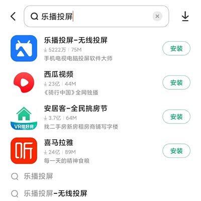 第二种方法,下载应用市场APP,在市场市场里搜索乐播投屏下载并安装,小米应用市场里就有乐播投屏。不管哪种方法,下载完后一定要把软件升级到最新版本,以方便功能的正常使用。见下图: