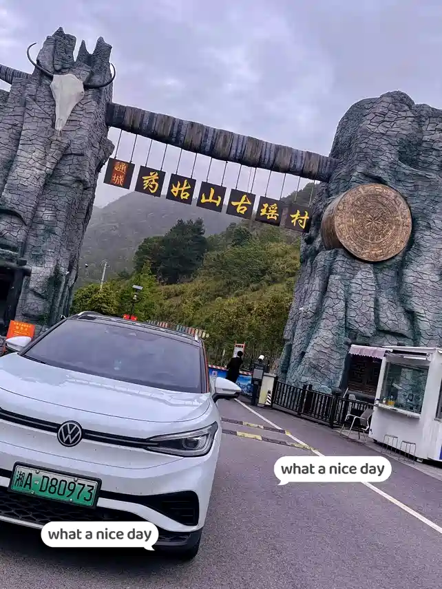 刚到景区把车子特意停在景区牌匾这里拍照打卡(是在工作人员允许的情况下),然后又顺便拿着我随身携带的ID4.X车模进行摆拍,我想应该会非常出片。果不其然,拍出来的效果那是杠杠的。