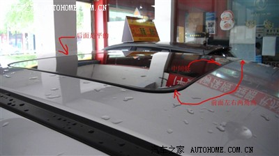 4、天窗漏水问题:本人猜测该天窗可能是67为了降低成本而采购的专业配件厂的标准配件,不是专门为该型车定做的专配天窗,故天窗前面的弧度与车顶棚不是完全吻合,前面的左右两角要高一些,免不了会有水渗入天窗内的集水槽,但只要天窗前面两侧的下水管不堵塞,集水槽是存不住水的,无论雨下的多大(南昌这几天的暴雨不可谓不大),车子如何颠簸,都不会有水哪怕是沾到天窗边上的织物上。我也问了我的开车修厂的朋友,据他说,天窗是活动的,绝大部分车就算刚出厂不渗水,过段时间也会渗,只要不会渗到打湿内饰就是正常的。听了他的话,加上经过秋、冬、春三个季节,特别是最近连续暴雨的洗礼考验,使我对天窗增强了信心。觉得买了天窗太好了(本人天生怕闷,天窗的好处随用谁知道)。