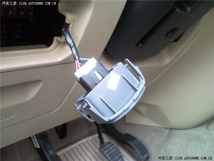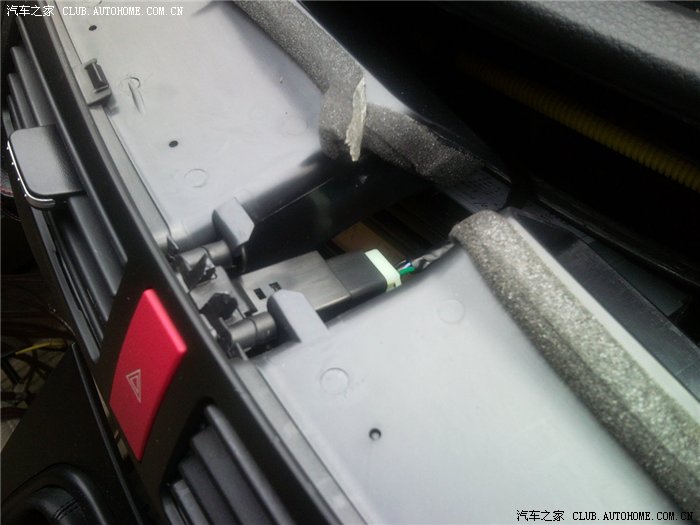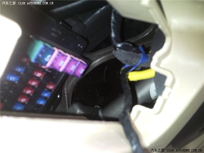 这张是从预留控制小盖的孔往里面照,前雾灯开关的接口就绑在蓝色的那个位置,还有一条塑料带绑紧,被我剪掉了,黑色线引出来的就是雾灯接口