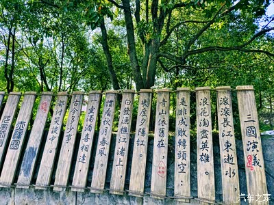 雕塑园小广场两侧木条镌刻了多首关于三国故事脍炙人口的古诗词,杨慎的临江仙千古名句自然不会缺席。