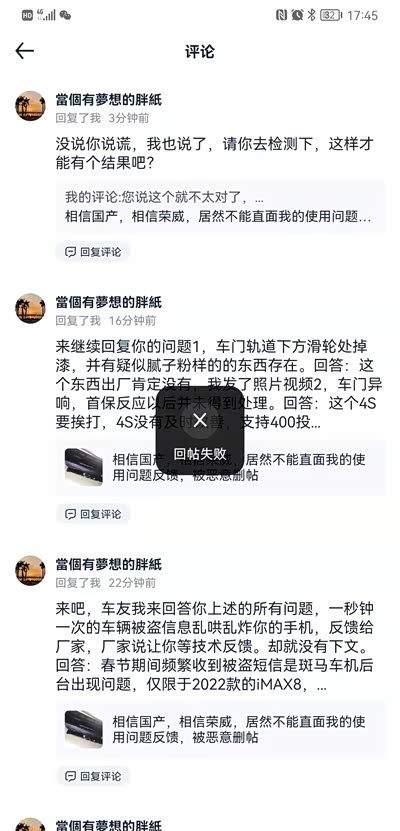 3.发现该情况以后我第一时间和厂家的服务小组进行反馈,得到反馈为和当地售后联系。这个我也认了,没啥事。接下来,我就在汽车之家上面进行发帖,并将我的情况如实写下来和各车友进行探讨,我并不想黑厂家或者这台车。但是遇见自己车辆出了这样的问题,再加上该车辆日常使用时候其他的问题,所以想和同样为车主的车友们在汽车之家imax8群里进行探讨。因此我将情况发出并配图。