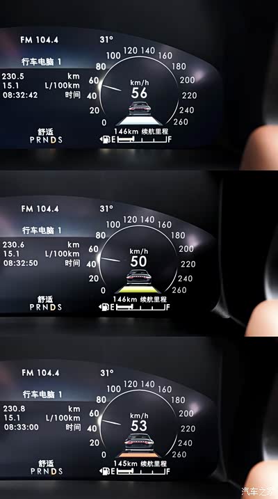 时速表圈内可实时呈现当前跟车状态:白色代表距离安全、黄色代表距离偏近、红色代表距离过近,并且会随车速提高自动扩大警戒距离。