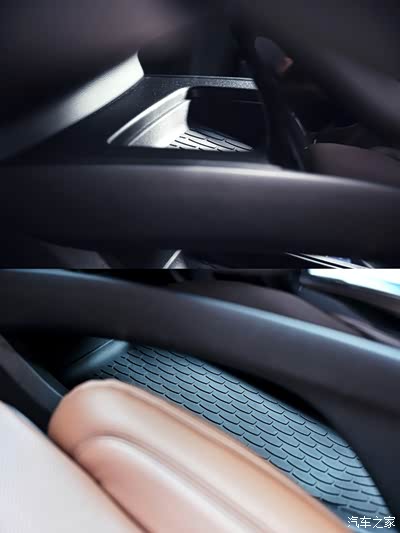 中控台采用与尾灯相同的设计语言,也称作“地平线样式”,前排空调面板横贯整个中控;上下由棕色皮质面料环绕包覆,再外围是银色细纹饰板、钢琴烤漆饰条和软质蒙皮,很有层次感。