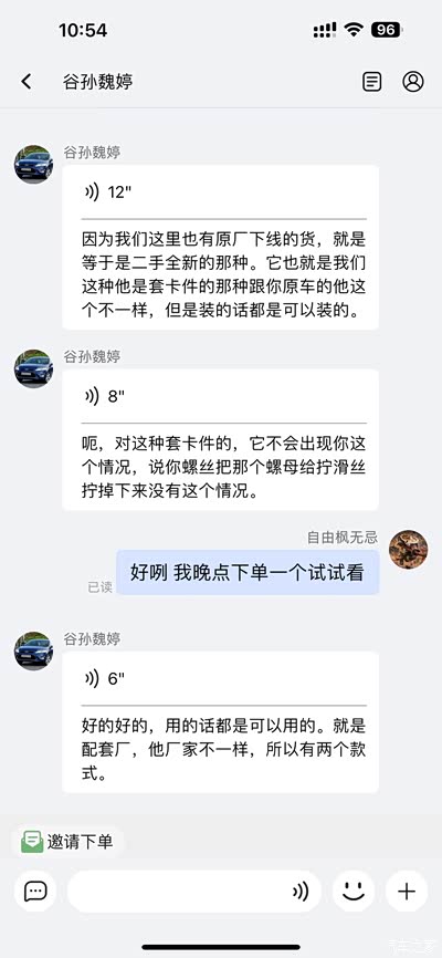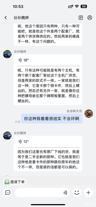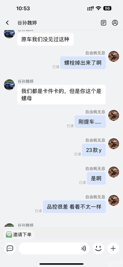 前面七个螺丝均顺利安装,结果安到最后一个,螺丝怎么也拧不上扣了。换了车管所给配的螺丝挨个试也不行,就是拧不动,我和我朋友换着来,他是检车线的,也很专业,还是未果。最后用了一点力气,我没有徒手掰螺丝的肌肉,然后,这个牌照框的螺栓扣,就从牌照框掉下来了。我联系了我的提车群,我的这辆车提之前,购车的销售就已经离职了,我也不知道究竟是谁负责跟我对接。只能在交车群里咨询。