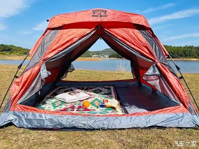 在这么美的风景里安营扎寨,取出帐篷,打开四角,准备拉起帐篷,很便捷,基本上一个人操作就可以!支撑好了帐篷,打好地钉固定就可以了,大狗帐篷的空间还是蛮大的,而且帐篷的用料是那种防水布面料,很不错。帐篷的最上面还有大狗标识,哈哈,也算是专属定制了!